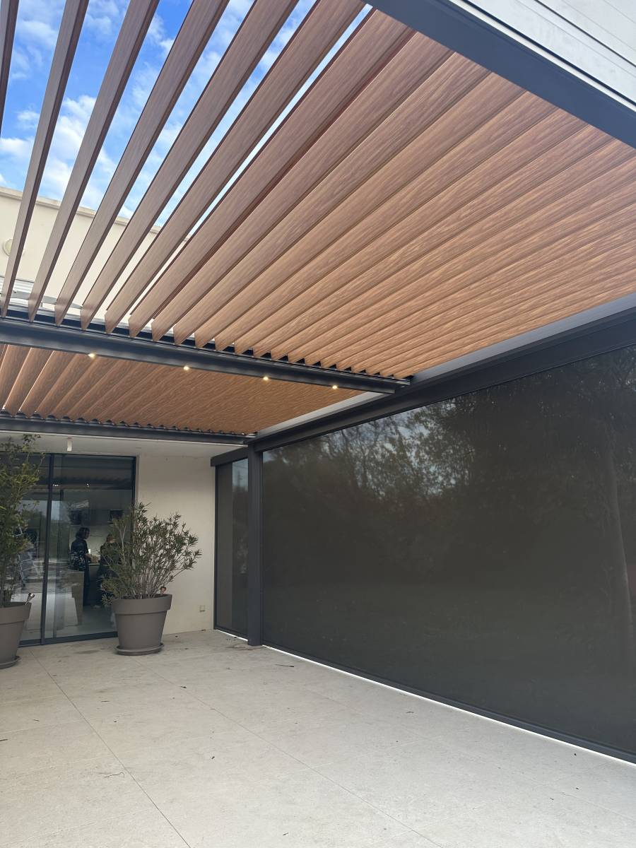 Que vous souhaitez agrandir votre espace extérieur ou protéger votre jardin, Nos pergolas Bioclimatiques lames bois by Cauchi Design en aluminium allient fonctionnalité, esthétique et authenticité .